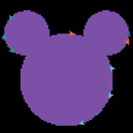 Select "Mickey Mouse" from the SURFACE-SHAPE chooser. SETUP and tell the model to GO. What happens to turtles when they pass over the acute angles where Mickey's ears meet his head? Try adjusting the STEP-SIZE slider while the model is running to investigate.