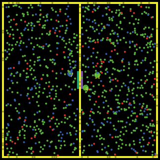 2. Two particles "collide" if they find themselves on the same patch (NetLogo's View is composed of a grid of small squares called patches).