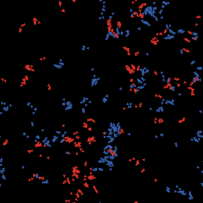 This is a simple model of population genetics. There are two populations, the REDS and the BLUES. Each has settable birth rates. The reds and blues move around and reproduce according to their birth rates. When the carrying capacity of the terrain is exceeded, some agents die (each agent has the same chance of being selected for death) to maintain a relatively constant population. The model allows you to explore how differential birth rates affect the ratio of reds to blues.