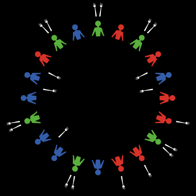 A fork sits on the table in between each pair of philosophers, so there are exactly as many forks as philosophers. However, the spaghetti is quite messy, so in order to eat, each philosopher needs to be holding two forks, both the fork to her left and the fork to her right. Clearly, if all the philosophers are to get some spaghetti, they'll have to share the forks.
