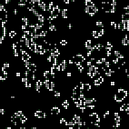 As the model runs, a small green dot indicates where a cell will be born, but is not treated as a live cell. Grey cells are cells that are about to die, but are treated as live cells.