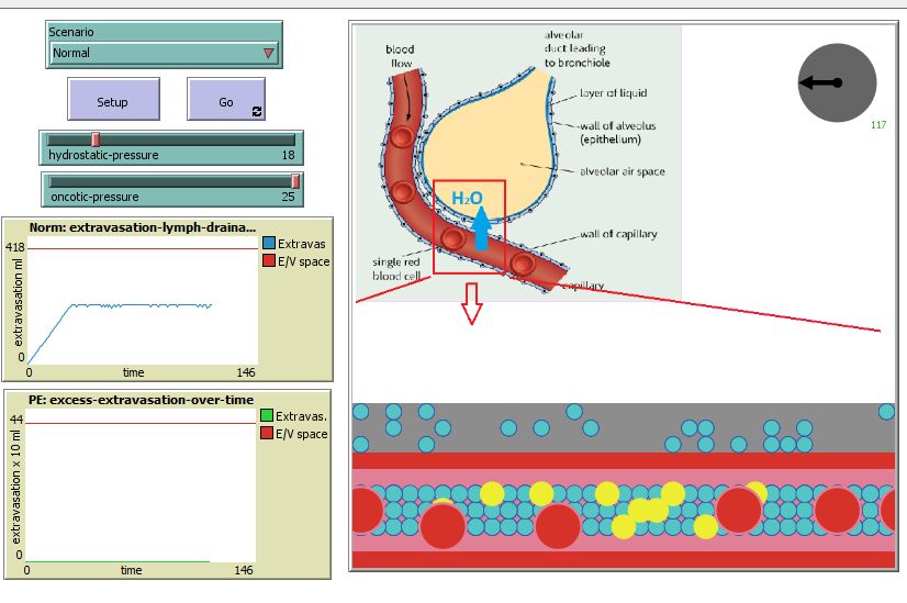The ultimate physiological function of the lung is oxygenation of the blood and the main functional characteristic of this process is ‚oxygenation efficiency’, which can be dramatically affected by excessive extravascular lung water. This particular model does not count for ‚oxygenation’ but can be extended by adding more elements/agents. Although Red Blood Cells (RBC - red color/circle shape) in the actual model do not bear any particular functional load they are included in the model for a ’more realistic picture’ from physiological point of view and as a ’bridge’ for future model extensions.