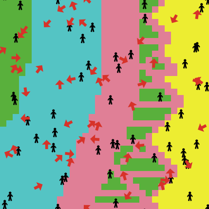 In terms of turtles, there are two types: people (black in colour) and arrows (red in colour). People could represent a semi-sedentary group and the arrows could represent hunter gatherers. As mentioned above, both groups could have been hunter gatherers. Both groups of turtles interact with the patches (grass which represents food) and each other. The turtles ‘eat’ the grass and gain energy from that. Turtles also reproduce but only with similar type. People reproduce with people and arrows reproduce with arrows.