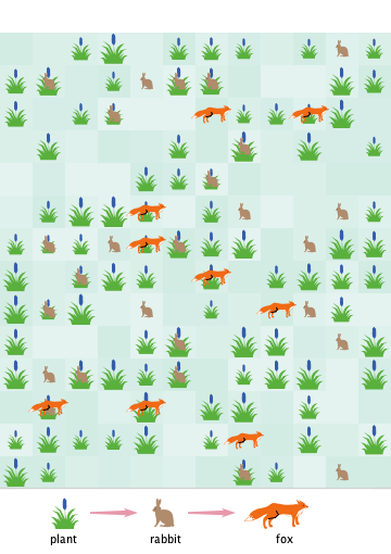Foxes and rabbits gain energy when they find food and will produce offspring when they accumulate enough energy.