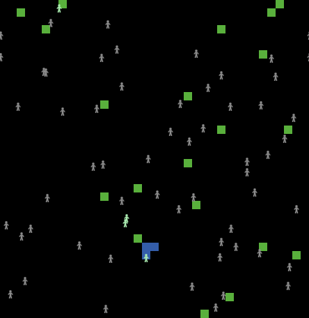 turtles-own [ awareness ] patches-own [ non-usage ] to setup ca set-default-shape turtles "person" crt people ask turtles [ set color gray fd random 25 setxy random-xcor random-ycor set awareness 0 ] ask n-of centers patches [ set pcolor green set non-usage 0 ] reset-ticks end to wander fd 1 lt random 50 rt random 50 end to go ask turtles [ wander ] ;; adjust awareness according to our location ask turtles [ if ( pcolor = green or pcolor = blue ) [ set awareness awareness + 5 ] if ( pcolor = black ) [ set awareness awareness - 1 ] set non-usage 0 ] ; inform others around us ask turtles with [ well-informed? or activist? ] [ ask other turtles-here with [ unaware? or aware? ] [ set awareness awareness + 1 ] ] ; place limits on the awareness value ask turtles with [ awareness > 15 ] [ set awareness 15 ] ;; setting max awareness ask turtles with [awareness < 0 ] [ set awareness 0 ] ;; setting minimum awareness color-turtles ;; create centers ask turtles with [ activist? ] [ let open-patches neighbors with [ pcolor = black ] if ( any? open-patches ) [ ask one-of open-patches [ set pcolor blue ] ] ] ;; a random patch turns green ;; ask patches with [ pcolor != black ] ;;WE WANT NON-USED CENTERS TO DISAPPEAR [ if ( not any? turtles-here ) [ set non-usage (non-usage + 1) ] if ( non-usage > non-usage-limit ) [ set pcolor black ] ] do-plotting tick end to color-turtles ask turtles [ ifelse ( activist? ) [ set color 64 ] [ ifelse ( well-informed? ) [ set color 66 ] [ ifelse ( aware? ) [ set color 68 ] [ set color gray ] ] ] ] end to-report activist? report awareness >= 15 end to-report well-informed? report awareness >= 10 and awareness < 15 end to-report aware? report awareness >= 5 and awareness < 10 end to-report unaware? report awareness >= 0 and awareness < 5 end to place-centers if ( mouse-down? ) [ ask patch mouse-xcor mouse-ycor [ set pcolor green ] display ] end to do-plotting set-current-plot "Avg. Awareness" set-current-plot-pen "Awareness" plot mean [ awareness ] of turtles set-current-plot "Level of Awareness" set-current-plot-pen "Activist" plot count turtles with [ activist? ] set-current-plot-pen "Well Informed" plot count turtles with [ well-informed? ] set-current-plot-pen "Aware" plot count turtles with [ aware? ] set-current-plot-pen "Unaware" plot count turtles with [ unaware? ] end ; Copyright 2007 Uri Wilensky. ; See Info tab for full copyright and license.