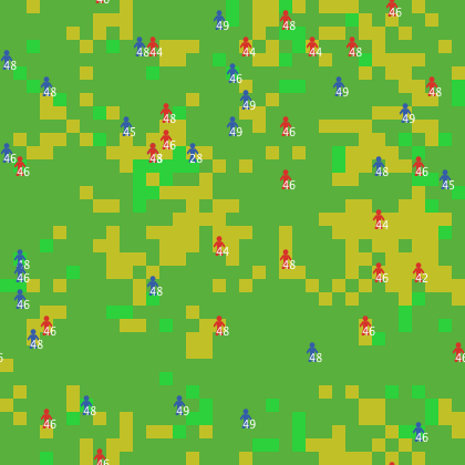 turtles-own [ energy ] patches-own [ resource-type ] breed [ recyclers recycler ] breed [ wastefuls wasteful ] to setup clear-all set-default-shape turtles "person" create-recyclers num-recyclers [ set color blue ] create-wastefuls num-wastefuls [ set color red ] ask turtles [ set size 1.5 ;; easier to see setxy random-pxcor random-pycor set energy max-stored-energy / 2 ] ask patches [ set resource-type "new" update-patch ] reset-ticks end to go ask recyclers [ recycler-process-patch ] ask wastefuls [ wasteful-process-patch ] ask turtles [ move if (energy > max-stored-energy) [ set energy max-stored-energy ] if energy < 0 [ die ] ] ifelse (show-energy?) [ ask turtles [ set label (round energy) ] ] [ ask turtles [ set label "" ] ] update-environment ask patches [ update-patch ] tick end to move ;; turtle procedure let target-patch one-of neighbors if (agents-seek-resources?) [ let candidate-moves neighbors with [ resource-type = "new" ] ifelse any? candidate-moves [ set target-patch one-of candidate-moves ] [ set candidate-moves neighbors with [ resource-type = "recycled" ] if any? candidate-moves [ set target-patch one-of candidate-moves ] ] ] face target-patch move-to target-patch set energy (energy - 1) end to recycler-process-patch ifelse (resource-type = "new" ) [ if (energy <= max-stored-energy - 2) [ set energy energy + 2 ] ] [ ifelse (resource-type = "recycled" ) [ if (energy <= max-stored-energy - 1) [ set energy energy + 1 ] ] [ set energy energy - recycling-waste-cost set resource-type "recycled" ] ] end to wasteful-process-patch ifelse (resource-type = "new" ) [ if (energy <= max-stored-energy - 4) [ set energy energy + 4 set resource-type "waste" ] ] [ if (resource-type = "recycled") [ if (energy <= max-stored-energy - 2) [ set energy energy + 2 set resource-type "waste" ] ] ] ; if resource-type is "waste", then we gain nothing. end to update-patch ifelse (resource-type = "new") [ set pcolor green ] [ ifelse (resource-type = "recycled") [ set pcolor lime ] [ set pcolor yellow - 1 ] ] end to update-environment ask patches with [ resource-type = "recycled" ] [ if random 100 < (resource-regeneration / 10) [ set resource-type "new" ] ] ; waste is less likely to be renewed naturally by the environment ; in this model, we arbitrarily assume 5 times less likely ask patches with [ resource-type = "waste" ] [ if (random 5 = 0) and (random 100 < (resource-regeneration / 10)) [ set resource-type "new" ] ] end ; Copyright 2007 Uri Wilensky. ; See Info tab for full copyright and license.