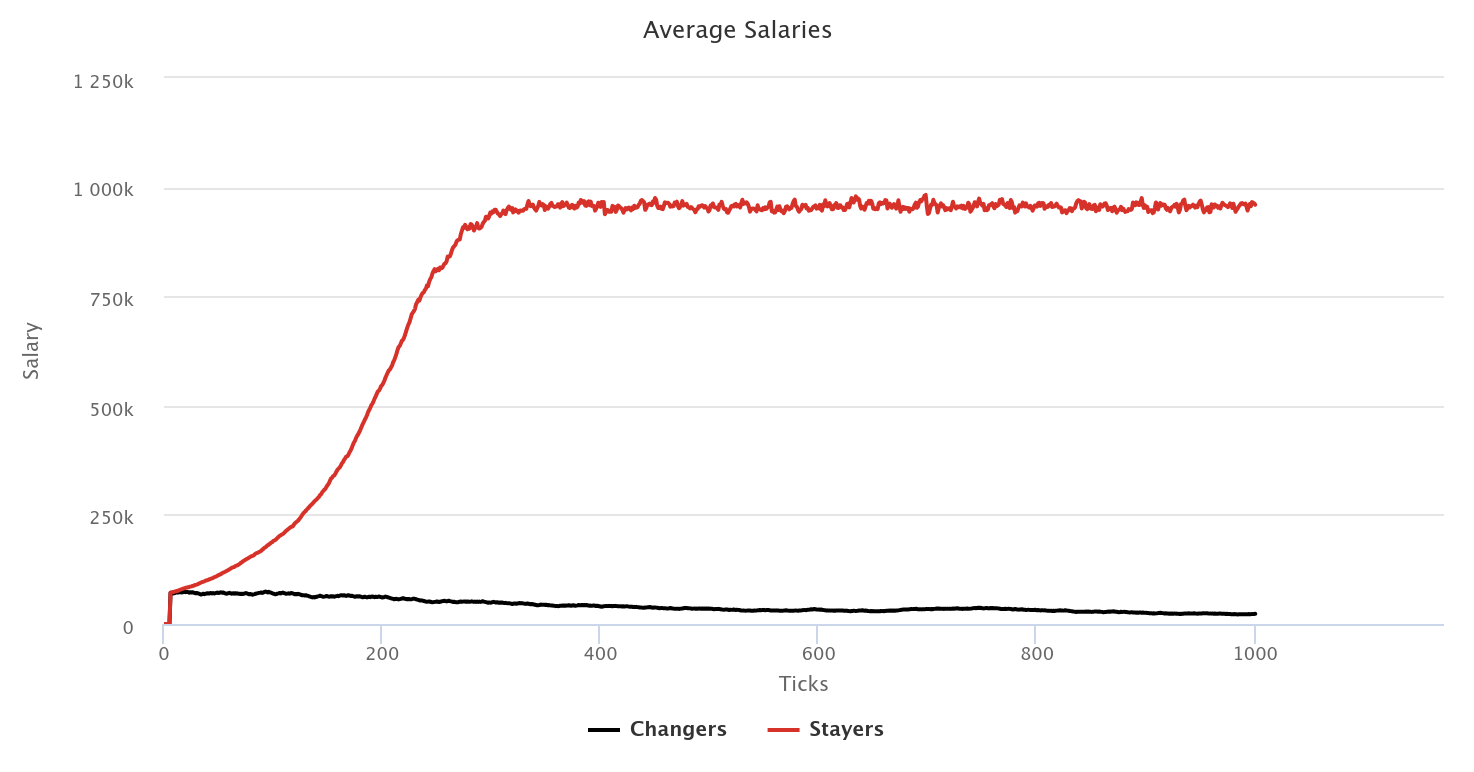 Employees have a tendency (stayers/changers) which influences which decision they make at each tick. Stayers have a tipping point which is a random value at which they will forego their tendency.