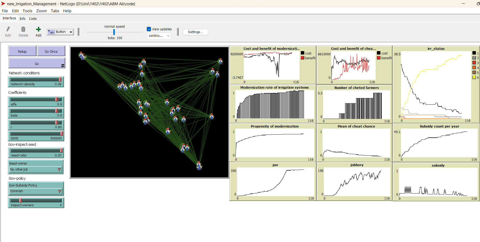 The ABM model is designed to model the adaptability of farmers in DTIM. This model includes two groups of farmers and local government admins agents. Farmers with different levels, with low WP of DTIM, are looking for economic benefits and reduced irrigation and production costs. Meanwhile, the government is looking for strategic goals to maintain water resources’ sustainability. The local government admins employ incentives (subsidies in this study) to encourage farmers to DTIM. In addition, it is used as a tool for supervision and training farmers’ performance. Farmers are currently harvesting water resources with irrigation systems and different levels of technology, and they intend to provide short-term benefits. Farmers adjust the existing approach based on their knowledge of the importance of DTIM and propensity to increase WP and cost-benefit evaluation. DTIM has an initial implementation fee. Every farmer can increase WP by using government subsidies. If none of the farmers create optimal use of water resources, access to water resources will be threatened in the long term. This is considered a hypothetical cost for farmers who do not participate in DTIM. With DTIM, considering that local government admins’ facilities cover an essential part of implementation costs, farmers may think of profiting from local government admins’ facilities by selling that equipment, especially if the farmers in the following conditions may consider selling their developed irrigation equipment. In this case, the technology of their irrigation system will return to the state before development. - When the threshold of farmers’ propensity to DTIM is low (for example, in the conditions of scarcity of access to sufficient training about the new irrigation system or its role in reducing the cost and sustainability of water resources) - When the share of government subsidy is high, and as a result, the profit from the sale of equipment is attractive, especially in conditions of inflation. - Finally, farmers’ honesty threshold should be reduced based on the positive experience of profit-seeking and deception among neighbors. Increasing the share of government subsidies can encourage farmers to earn profits. Therefore, the government can help increase farmers’ profits by considering the assessment teams at different levels with DTIM training . local government admins evaluations monitor the behavior of farmers. If farmers sell their improved irrigation system for profit, they may be deprived of some local government admins’ services and the possibility of receiving subsidies again. Assessments The local government admins can increase farmers’ honesty. Next, the ABM model evaluates local government admins policies to achieve a suitable framework for water resources management in the Miandoab region.