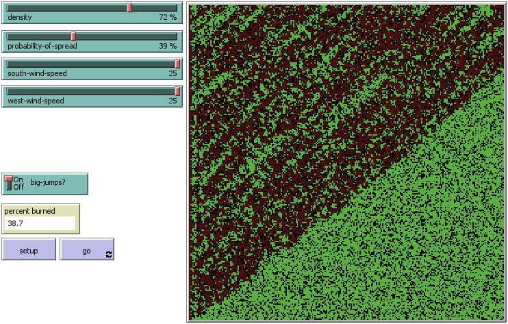 This project simulates the spread of a fire through a forest. It shows that the fire's chance of reaching the right edge of the forest depends critically on the density of trees. This is an example of a common feature of complex systems, the presence of a non-linear threshold or critical parameter. This model extends the Fire Simple Extension 2 model by adding BIG-JUMPS.